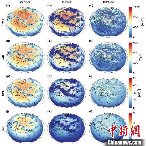 地表太陽輻射組分(短波輻射、光合有效輻射、紫外線A輻射、紫外線B輻射)的總輻射、直射及散射分量的空間分布。中國(guó)科學(xué)院空天院 供圖
